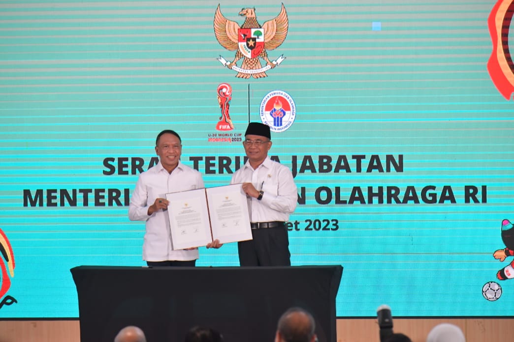 Zainudin Amali menyerahkan langsung jabatannya kepada Menko PMK Muhadjir usai sambutan para pihak dan perjalanan singkat terhadap prestasi yang di peroleh dalam masa kepemimpinan Zainudin Amali