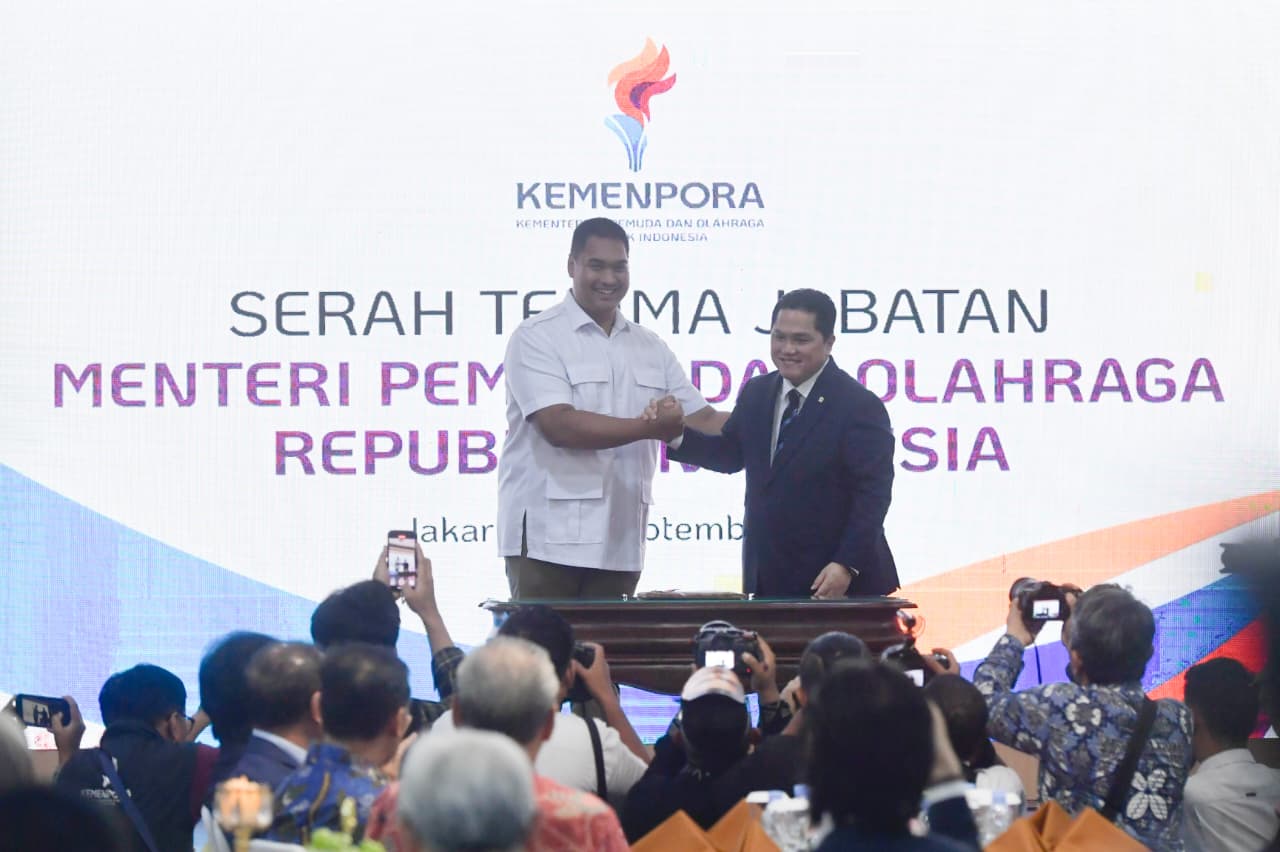 Jakarta: Kementerian Pemuda dan Olahraga (Kemenpora) RI menggelar Serah Terima Jabatan (Sertijab) Menteri Pemuda dan Olahraga (Menpora) RI dari Dito Ariotedjo kepada Erick Thohir Sertijab ini adalah tindak lanjut dari resuffle kabinet Merah Putih, sertijab dilakukan di Auditorium Wisma Kemenpora RI, Jalan Gerbang Pemuda Nomor 3, Senayan, Kamis (18/9) pagi.